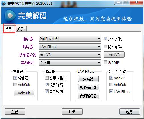 完美解码不仅涵盖了播放器的基础功能,还集成了编码解码功能。它能播放流行的各种格式的音视频、高清的多媒体文件以及 HDTV 的回放,可以说是一款全能型的影音解码器。