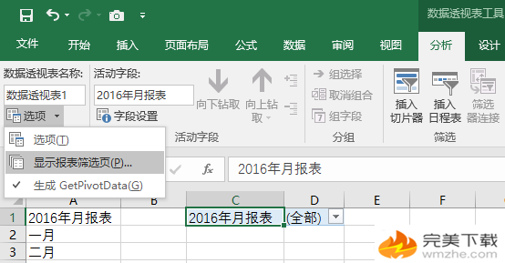 接下来选中 C1 单元格(即存放数据透视表的单元格),然后切换到“数据透视表工具-分析”选项卡,点击工具栏左侧“选项”边的箭头,从下拉菜单中选择“显示报表筛选页”。