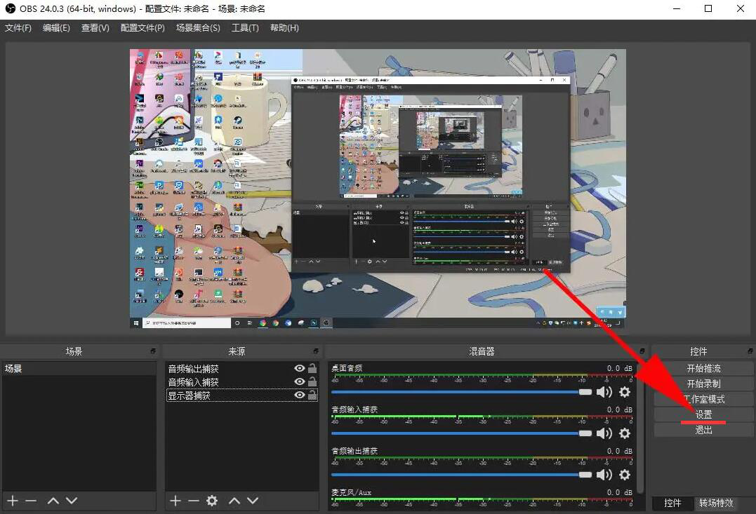 3. 打开 OBS Studio,停止推流,再点击其界面右下方的“设置”。