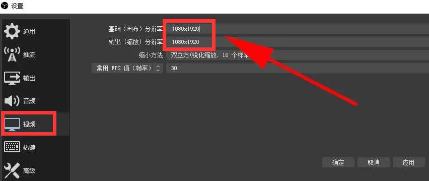 4. 接下来,在 OBS 的设置界面中,点击左侧栏中的“视频”,并在其右侧的界面中,根据自己想要的抖音直播伴侣的竖屏效果来设置分辨率。比如设置成“1080X1920”。