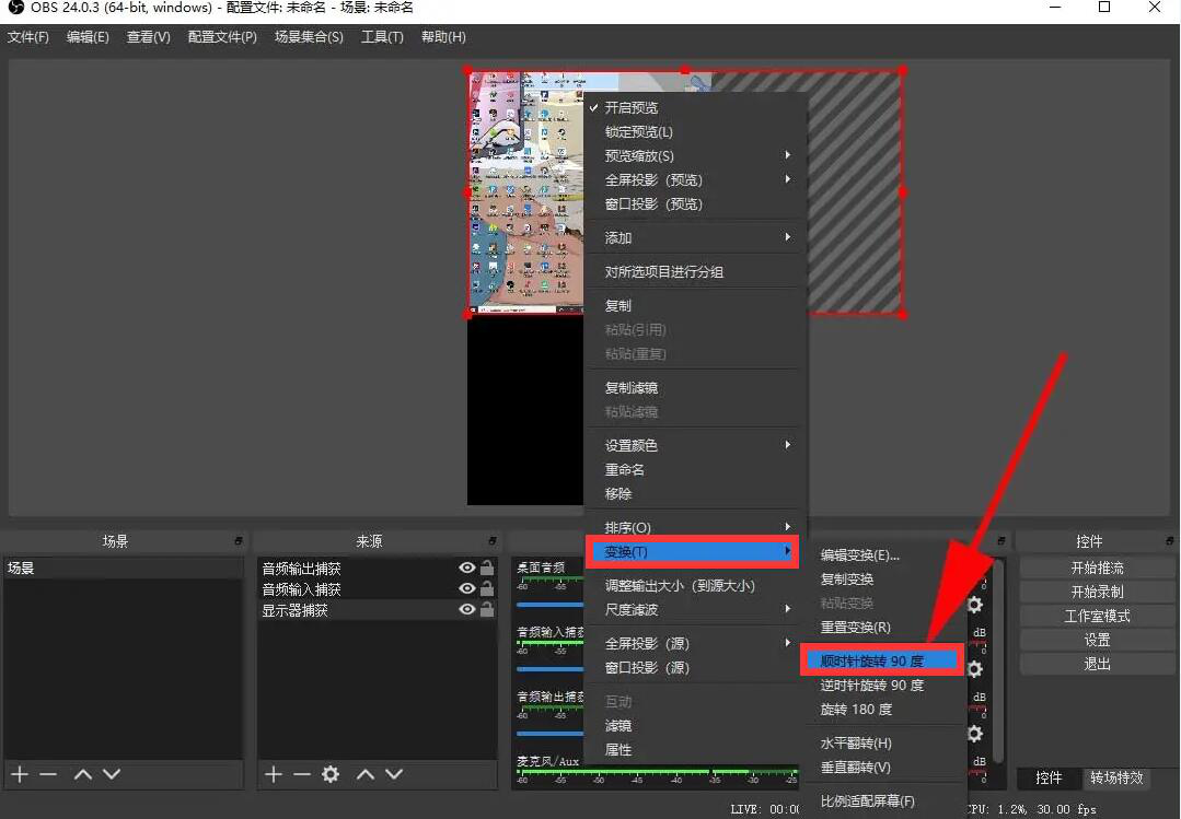6. 当鼠标右键单击该直播画面的时候,在右键菜单中点击“变换”中的“顺时针旋转 90 度”。