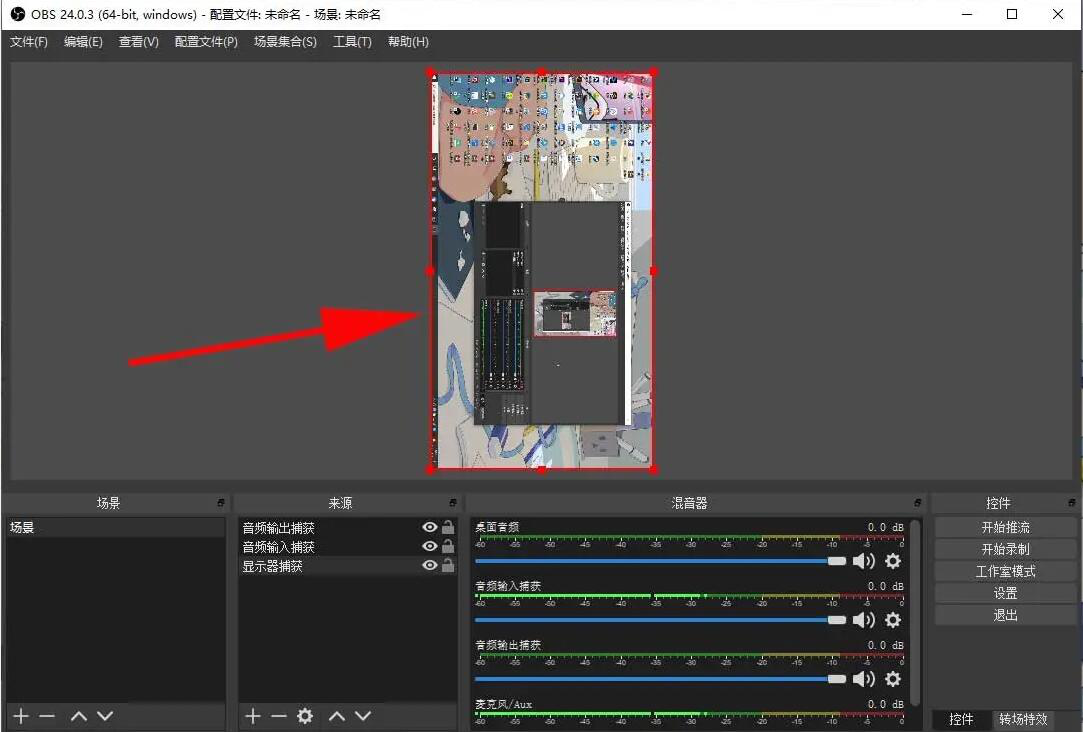 5. 分辨率设置完成,回到 OBS 的主界面,可以看到抖音直播伴侣变成了竖屏,但是画面没有改变,我们还需要继续设置。