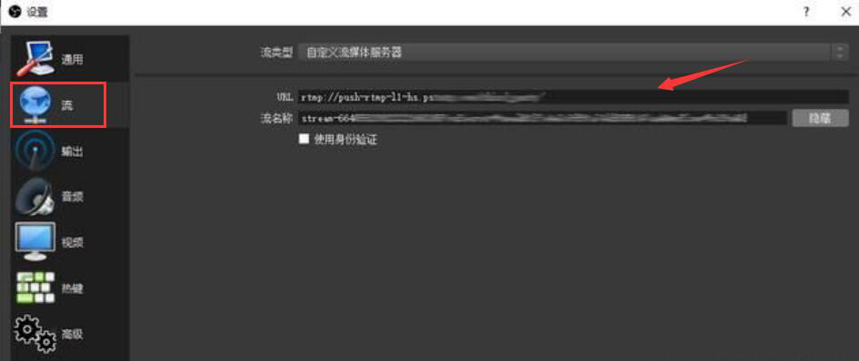 8. 接着,回到 OBS Studio 的设置界面,点击左侧菜单中的“流”。将第 2 步从抖音直播伴侣APP中复制的推流地址粘贴到如下图的 URL 中。推流地址中的 stream 后半部分作为流名称。