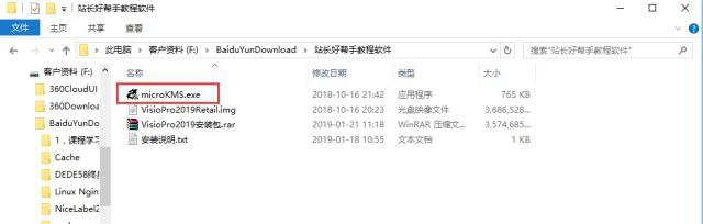5. Visio 2019 安装完成,还需要进行激活。重新打开之前下载解压的 Visio 2019 安装解压文件夹,在其中找到并双击“microKMS.exe”。