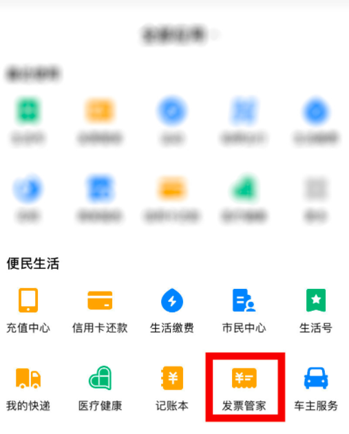 点击展开支付宝的全部功能,进入以下页面,找到“发票管家”选项,