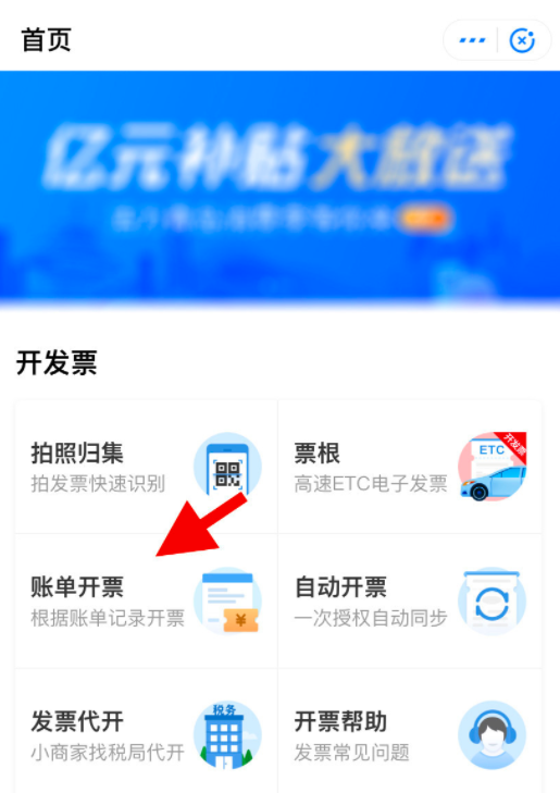 如图,进入发票管家小程序,在首页点击“账单开票”功能,