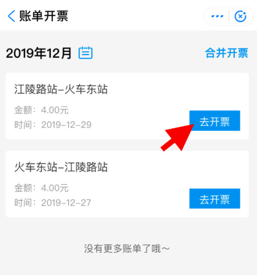 选择账单开票的相关日期,查看订单,在订单列表中点击“去开票”,
