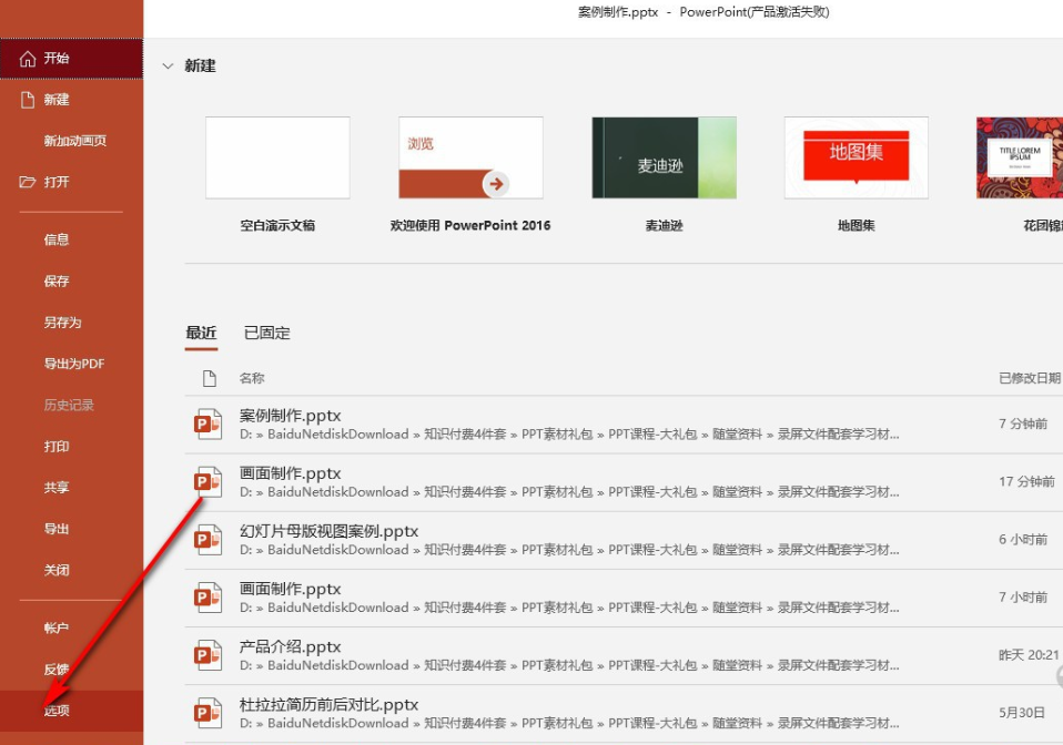 在 PPT 菜单栏点击“文件”,出现侧边栏,然后点击“选项”,