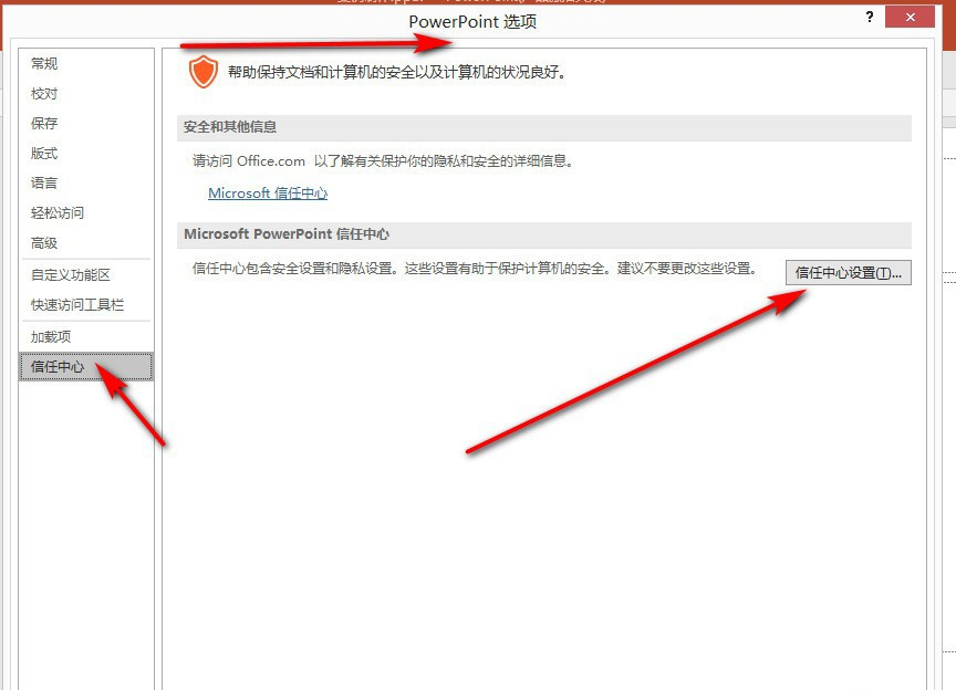 进入 PowerPoint 选项窗口,如图,点击“信任中心”,选择“信任中心设置”,