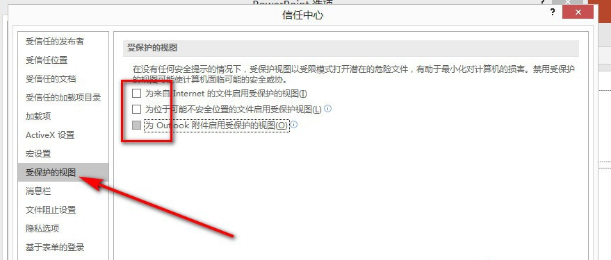 进入信任中心,如图,在左侧栏点击“受保护的视图”,然后取消勾选三个选项,点击确定,就能解决问题。