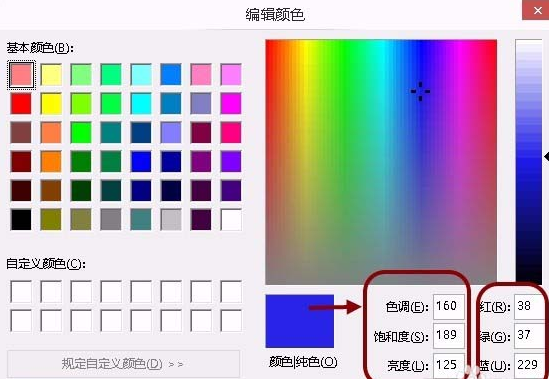 9. 这时弹出颜色设置的对话框,即可看到具体的,RGB 值(红色、绿色、蓝色)和 HSL 值(色调、饱和度、亮度)了。