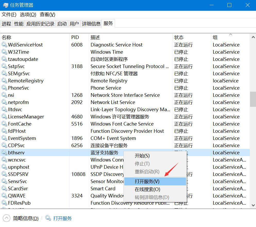 2. 然后,右键单击“蓝牙支持服务”,并在右键菜单中点击“打开服务”。