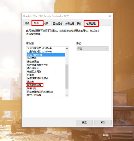 其次,在网卡驱动里设置开启 WOL 相关选项。在设备管理器中找到网卡设备,右键选择“属性”,然后在“电源管理”里面开启“允许此设备唤醒计算机”,然后在“高级”一栏里找到“关机网络唤醒”、“魔术封包唤醒”里设置成“开启”。