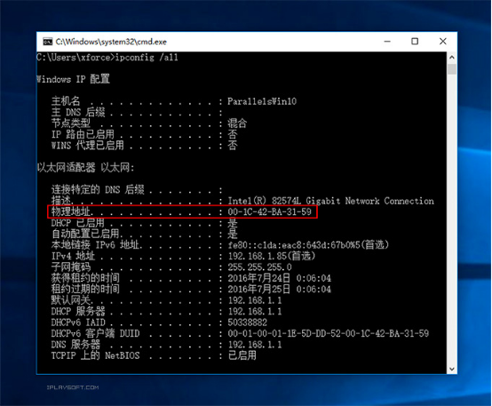 设置好前面的两项之后,我们就可以进行 WOL 唤醒了。实施 WOL 需要知道设备的 IP 地址以及网卡的物理地址 (MAC)。网卡的物理地址我们可以通过 ipconfig /all 命令来获得,一般是像 00-E7-0B-37-26-1F 的字符串。