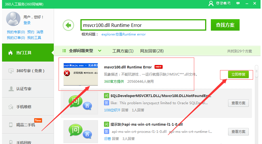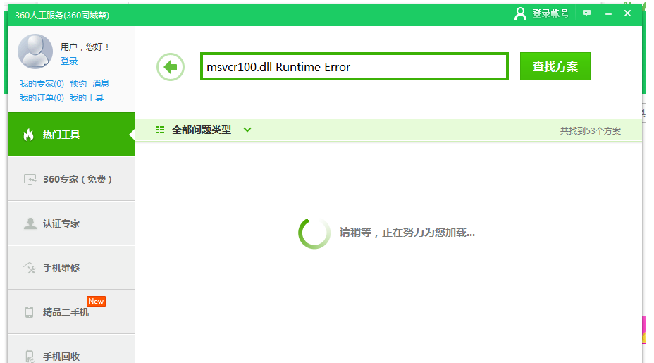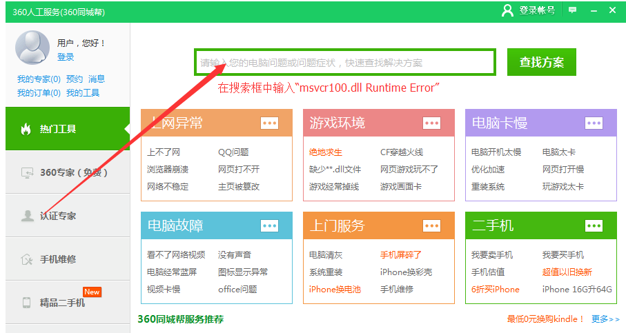 进入 360 人工服务界面,在框框中输入\" msvcr100.dll Runtime Error \",点击\"查找方案\"