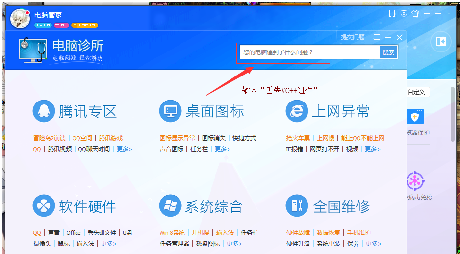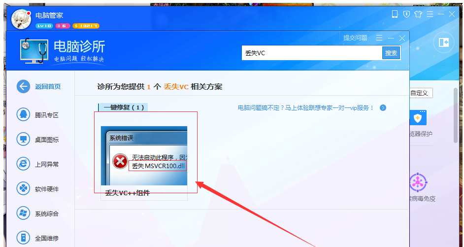 如图,在搜索栏中输入\"丢失 VC++ 组件\",点击搜索