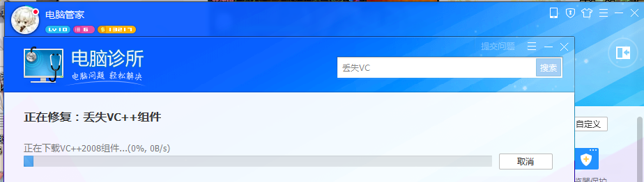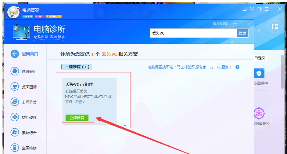 点击\"立即修复\",电脑管家即可修复问题,耐心等待