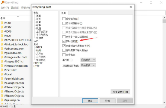 接着,我们在 everything 选项卡中找到"实时搜索"并将其勾选。成功勾选后,会发现窗口右下角的"应用"按钮是灰色的,这说明系统已经恢复"everything"的应用。