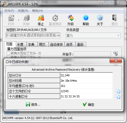 设置完成,点击"开始",进行密码的恢复,经过 2 分钟 18 秒,破解成功,密码是 12345,