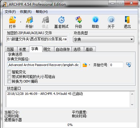 你也可以选择"字典解密",适合破解一些简单的密码,在字典文件路径中选择要加载的字典文件,