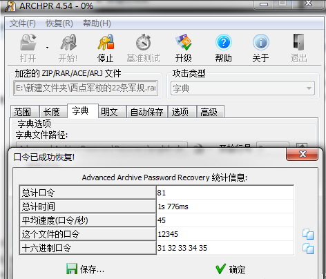 点击开始按钮,用了 45 秒就解出了压缩文件的密码,速度非常快。