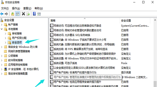 3. 点击展开"安全设置",然后依次点击"本地策略"-"安全选项",在右侧策略列表中找到"用户账户控制:管理员批准模式中管理员的提升权限提示的行为"并点开。