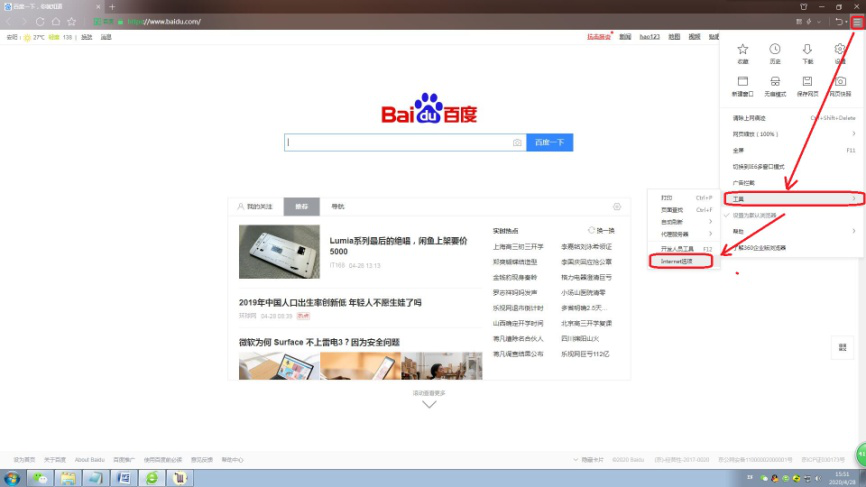 1. 首先单击桌面图标,打开 360 浏览器,点击右上角的"三"字图标,在其下拉菜单中选择"工具",然后点击"Internet选项"。