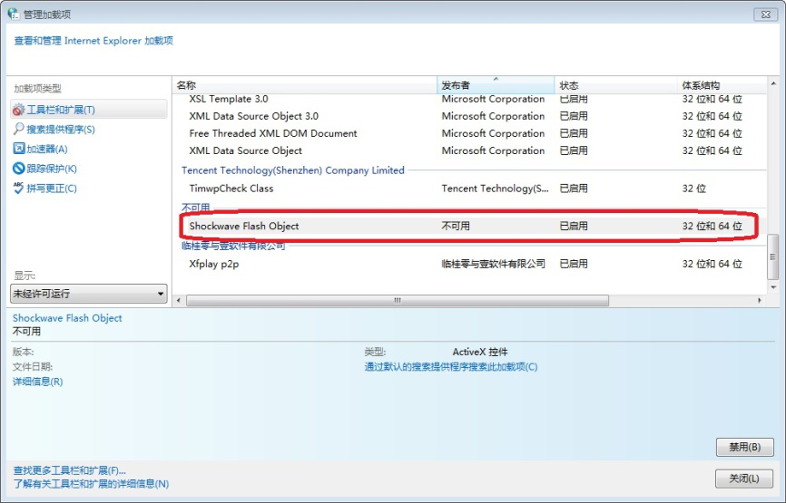 3. 弹出管理加载项窗口,在"工具栏和扩展(T)"对应的右侧程序列表中找到Flash插件(这里是 Shockwave Flash Object),右击在列表中点击"启用"即可。