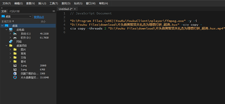 方法 2. 命令提示符代码转换。首先右键桌面打开记事本或者使用 Adobe Dreamweaver CC 2019 打开,然后将转换代码复制到记事本中,首先修改优酷 ffmpeg.exe 的位置,其次是 KUX 文件和 MP4 文件的位置;