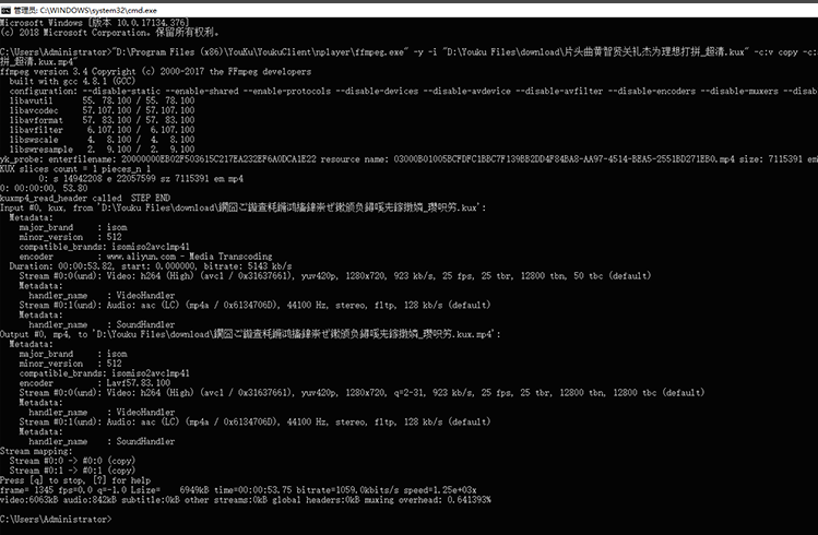 然后按住 "win+r",输入 "cmd" 并将转换代码复制到 "cmd" 中,直接按下 "enter" 键即可转换 KUX 文件(”C:\\Program Files (x86)\\YouKu\\YoukuClient\\nplayer\\ffmpeg.exe” -y -i “F:\\电影\\x_1080p.kux” -c:v copy -c:a copy -threads 2 “F:\\电影\\x.kux.mp4″)。