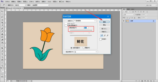 4. 在色彩范围的窗口中,调整颜色容差值后点击"确定"按钮。