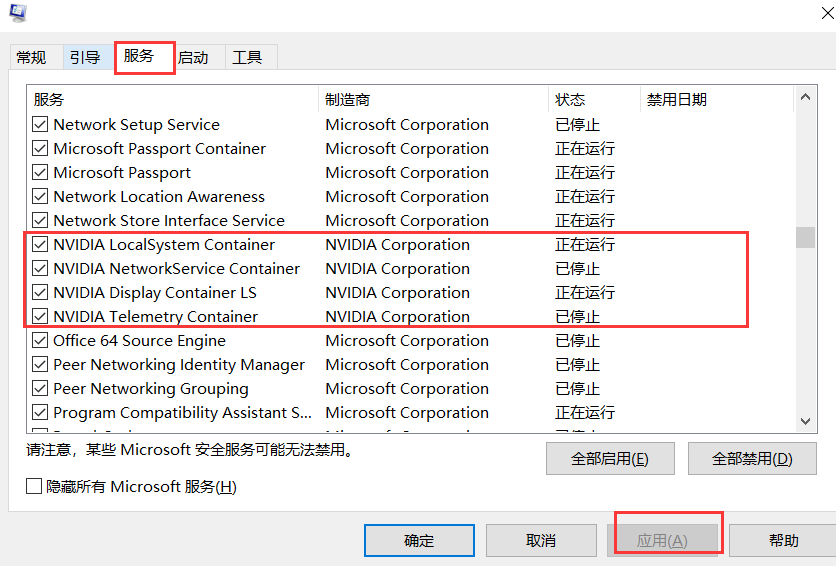 进入系统配置面板,点击"服务",勾选所有的 NAIVIDA,点击"应用",重启电脑,再次右击桌面,即可出现 NVIDIA 控制面板。