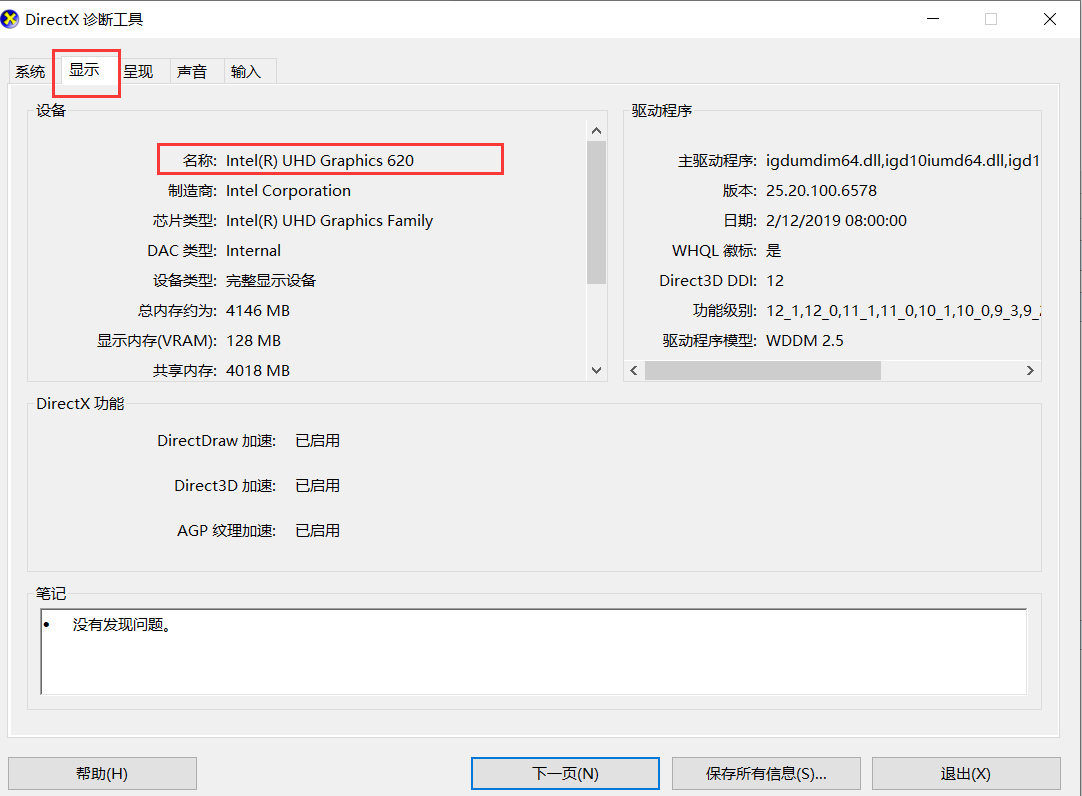 打开 DirectX 诊断工具,如图,点击上方"显示",查看当前使用的显卡,和 NAVIDIA 控制面板显示的 OBS Studio 设置集成显卡一致,