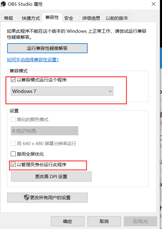 方法 3.如果问题依然存在,关闭 OBS Studio,鼠标右击桌面中的软件图标,选择"属性",进入属性面板,点击"兼容性",勾选"以兼容模式运行这个程序",选择 Windows 7,然后勾选"以管理员身份运行此程序",点击确定,