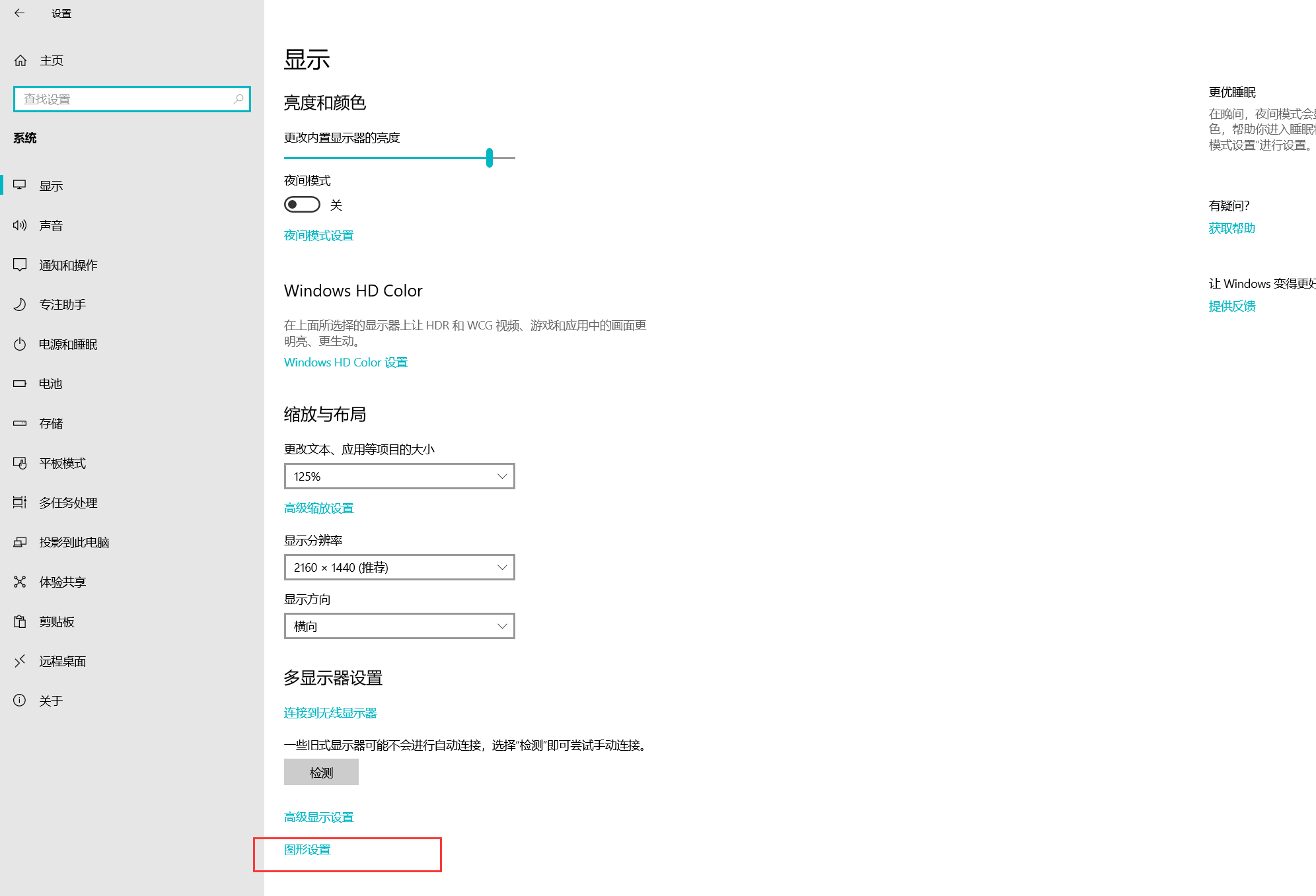呼出开始菜单,点击"设置",进入 Windows 设置面板,选择"系统",如图,点击"显示",选择"图形设置",进行相关设置,最后保存,