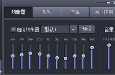 4. 播放菜单旁边,就是一个控制面板,这里有整个软件的设置参数,均衡器,视频,字母,播放控制。均衡器这里有很多现成的模板,比如流行音乐,电影,新闻,当然也可以自定设置成小波浪,记得要打勾启用先。