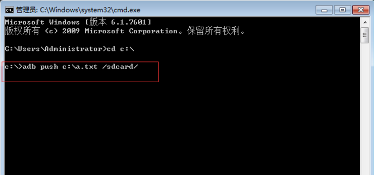 举例:在不进入设备 shell 下,输入 "adb push c:\\a.txt /sdcard/(从电脑推送 a.txt 文件到设备 sd 卡)"。