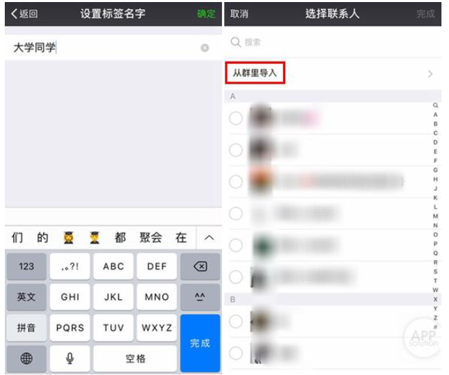 填写该标签的名字,如大学同学,然后点击"添加成员"——"从群里导入",选择大学同学群。