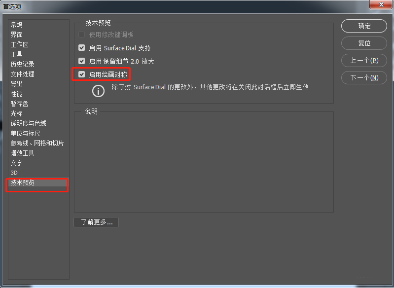 选择"技术预览",勾选"启用绘画对称",