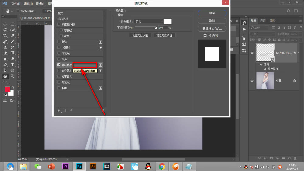 弹出图层样式对话框,选择"颜色叠加",点击后方的区域打开其界面,