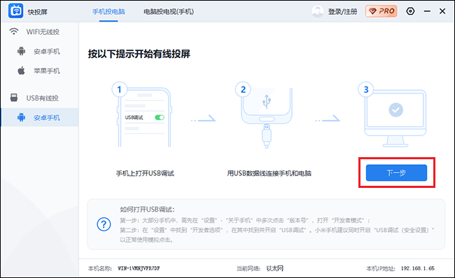 打开手机 USB 调试之后,需要在电脑中打开快投屏软件,插入 USB 数据线,连接手机和电脑,如图,在该软件的投屏方式中选择"USB 有线投"——"安卓手机",继续下一步,