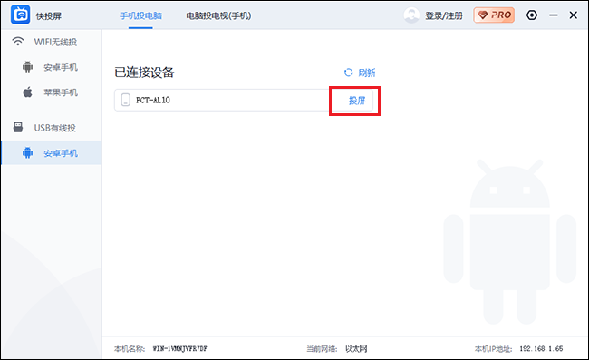 手机端确认连接后,将快投屏软件界面刷新一下,然后就可以在页面中显示对应设备,点击"投屏",就将手机屏幕内容投屏在电脑。