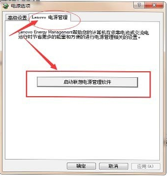 4. 弹出电源选项窗口,选择"Lenovo 电源管理"标签页,点击"启动联想电源管理软件",如果无法启动那么就说明 Lenovo 电源管理被某个杀毒软件禁用了。