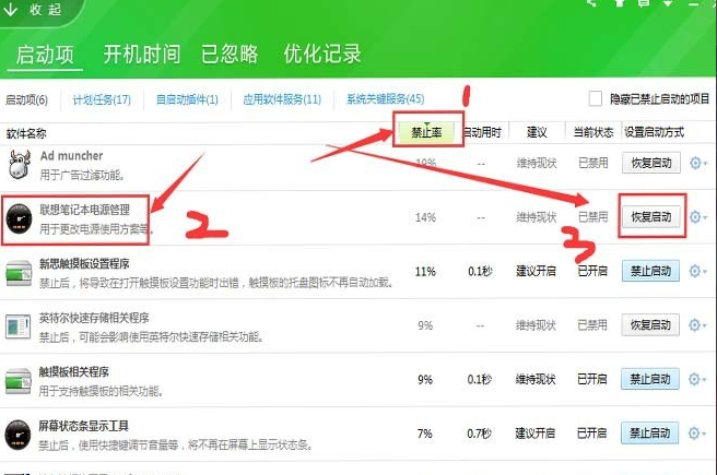 6. 在启动项列表中找到联想笔记本电源管理一项,点击右侧对对应"恢复启动"。