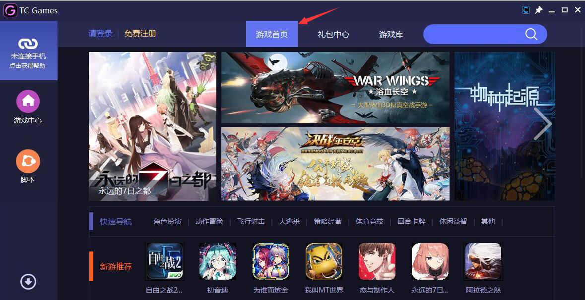3. 接下来,进入安卓投屏软件 tcgames 的游戏首页,用户将需要投屏到电脑的游戏进行下载。