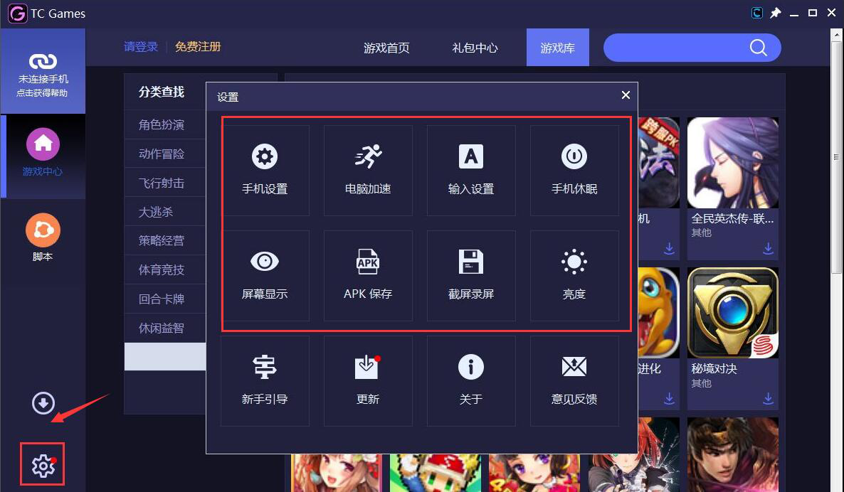 4. 选好游戏下载后,切换回安卓投屏软件 tcgames 的主界面。用户可以根据自己投屏的需要,点击左下方的设置,对屏幕显示. 亮度等进行设置。