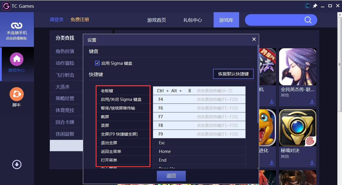 5. 安卓投屏软件 tcgames 在使用前,用户还需要设置电脑键盘的快捷键。以后,用户投屏玩手游时,tcgames 就能使用组合键来帮助操作了。