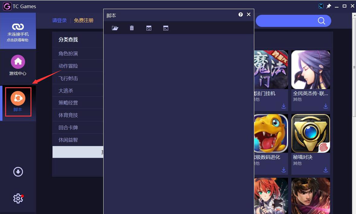 6. 最后,用户还需要在安卓投屏软件 tcgames 中为用户的手机建立脚本,并将该脚本下载加载至 tcgames 中。