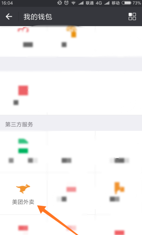 小编在美团的手机客户端上看了,客户端并没有这个服务,而只有外接的美团外卖才有,所以我们要在钱包里面找到第三方应用的"美团外卖",点击该应用入口进到美团外卖页面。