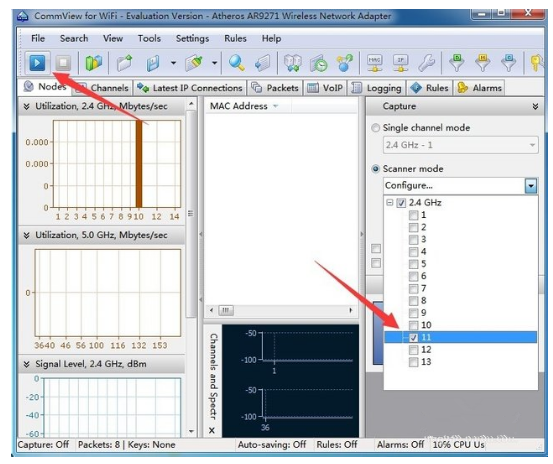 3. 接下来,我们需要利用另一款叫做 commview for wifi 的软件,运行 commview for wifi 程序,从"Capture"窗口中,点击"Scanner Mode"(扫描模式)下拉列表,从中选择要扫描的信道,接着在其程序主界面中点击"Scanner"(扫描)"按钮,即可搜索指定俯首下的隐藏 WiFi 网络。